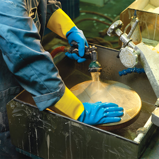 Các quy trình như tẩy rửa kim loại, xi mạ, phun sơn và xử lý bề mặt luôn sử dụng hóa chất ăn mòn hoặc dung môi mạnh. Dung môi trong sơn, chất tẩy dầu hay dung dịch xử lý kim loại có thể thấm qua da rất nhanh nếu người lao động không được bảo vệ đúng cách. Trong môi trường này, găng tay chống hóa chất Nitrile hoặc PVC thường được ưu tiên vì khả năng chống thấm và chống dung môi hiệu quả. Việc dùng găng đúng chuẩn giúp thao tác an toàn hơn, đồng thời hạn chế tối đa tình trạng khô nứt, kích ứng hoặc bỏng da.