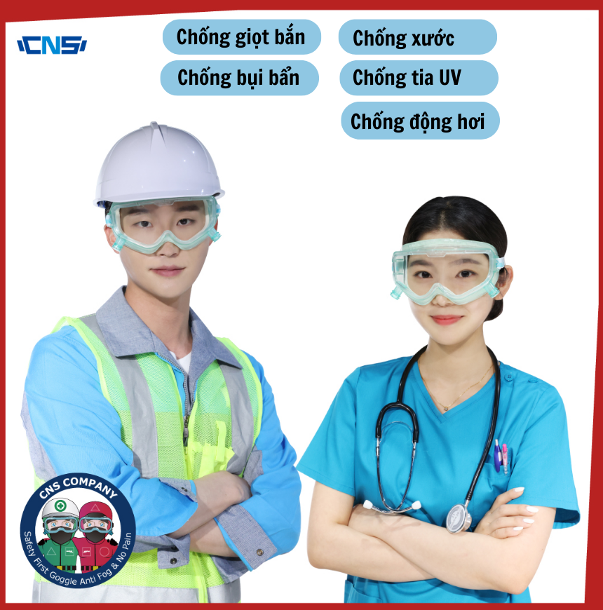 - Kính chống bụi, chống văng bắn hóa chất lỏng, tròng kính phủ chống động hơi nước, chống trầy xước, chống tia UV