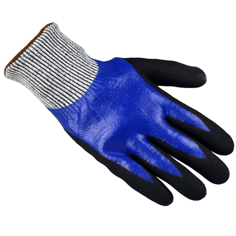 - Đặc điểm nổi bật: Lớp dệt bên trong siêu chống cắt (thường là A5 hoặc E), được phủ một lớp Nitrile dày toàn bộ bàn tay và các ngón.